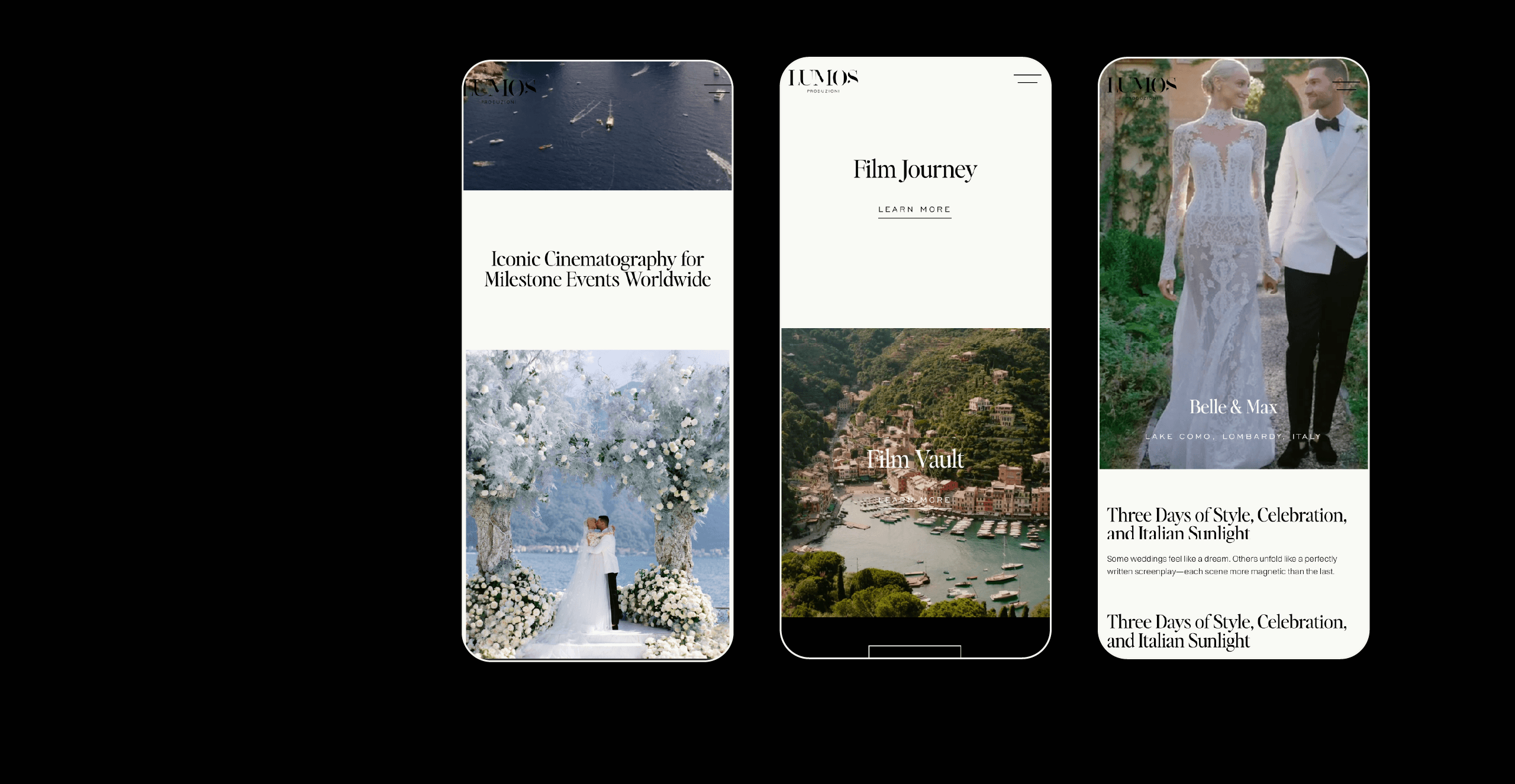 For Lumos Produzioni, a premier Italian wedding cinematography studio, we developed a comprehensive website strategy showcasing their artistry while creating an air of luxury and exclusivity. Our approach targeted wedding planners seeking innovative filmmakers and luxury clients desiring exceptional documentation. Each page guides users toward contact while building trust through visual storytelling.This strategy uniquely highlighted Lumos Produzioni's global availability, exceptional client experience, and approach that elevates wedding documentation to cinematic art.